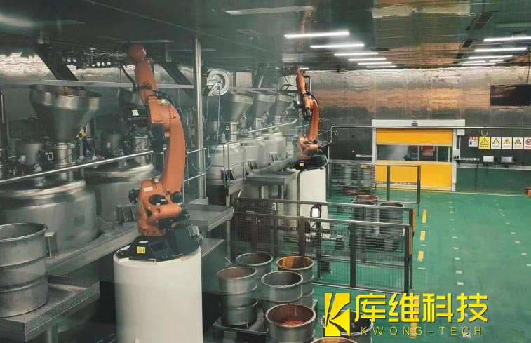 反應(yīng)釜具有精準控溫功能,并在不同的階段調(diào)節(jié)不同的爐溫,炒好之后,再通過管道輸入包裝車間。而包裝環(huán)節(jié)仍然由機器人進行操作,