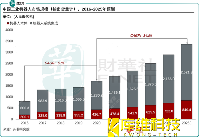 工業機器人是我國智能制造2025的核心抓手之一,是我國機器換人、制造業產業升級的核心環節。目前看,我國制造業三化仍處于初級階段,我國工業機器人中長期看仍具有較大的增長空間。據頭豹研究院預測,到2025年,中國工業機器人行業市場規模將達到3361.7億元,未來五年的年復合增長率約為14.5%。