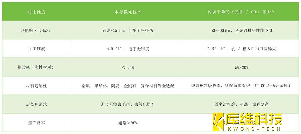 為更直觀體現(xiàn)優(yōu)勢,以下是水導(dǎo)激光與主流傳統(tǒng)激光技術(shù)的關(guān)鍵指標(biāo)對比: