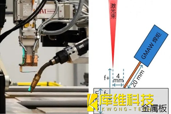 激光-電弧復(fù)合焊接(HLAW)裝置的組成,包括激光焊接頭、GMAW焊炬和鋼板的相對(duì)位置。