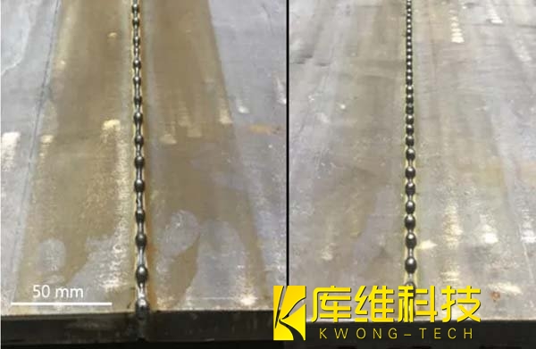 焊接樣品顯示出了優(yōu)異的焊接質(zhì)量,焊接底部沒(méi)有氣孔且無(wú)明顯駝峰,鋼板表面填充完美,這些都是良好底部形態(tài)的特征。這些結(jié)果得益于激光能量更有效的傳遞至板材底部,擴(kuò)大了熔池,從而避免了焊接駝峰缺陷的形成。這一發(fā)現(xiàn)對(duì)于理解和控制焊接過(guò)程中的物理現(xiàn)象具有重要意義,為焊接工藝的進(jìn)一步優(yōu)化提供了科學(xué)依據(jù)。