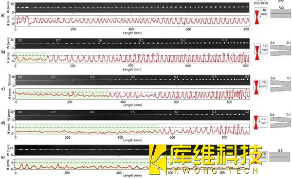 如圖所示,使用輪廓儀獲取的焊接底部的虛擬圖像,以及沿焊接底部軸線的線輪廓。這些圖像和輪廓顯示了焊接底部的形態(tài),包括是否存在駝峰,以及焊接過(guò)程中焊縫底部的寬度變化。