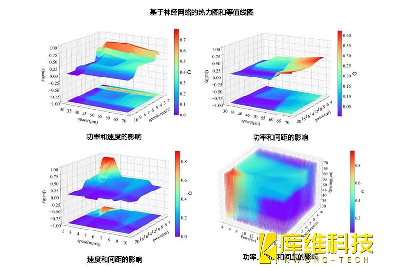 借助熱力圖與等值線圖,能清晰錨定提升加工效果的最優(yōu)參數(shù)區(qū)域:最大功率、最小間距、最大速度搭配下,加工質(zhì)量趨近最佳,力求達(dá)成無環(huán)形、小壁錐度的理想成果。物理仿真模型進(jìn)一步驗證了機器學(xué)習(xí)模型優(yōu)化結(jié)果,直觀展示出激光功率、填充間距變動時,小孔燒損深度、孔壁錐度、圓環(huán)結(jié)構(gòu)的變化態(tài)勢。