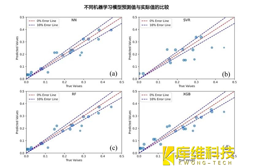 從實驗流程來看,整個過程分為清晰的三個階段,實驗階段收集原始數(shù)據(jù);預(yù)測和優(yōu)化階段借助機器學(xué)習(xí)深挖數(shù)據(jù)關(guān)聯(lián)、找尋最優(yōu)參數(shù);驗證和解釋階段則利用物理仿真模型為神經(jīng)網(wǎng)絡(luò)的結(jié)果 “背書”。實驗中的樣本點選取也頗具講究,24 個測試集樣本點的數(shù)據(jù)直觀呈現(xiàn)出不同機器學(xué)習(xí)技術(shù)預(yù)測值與實際值的貼合程度。