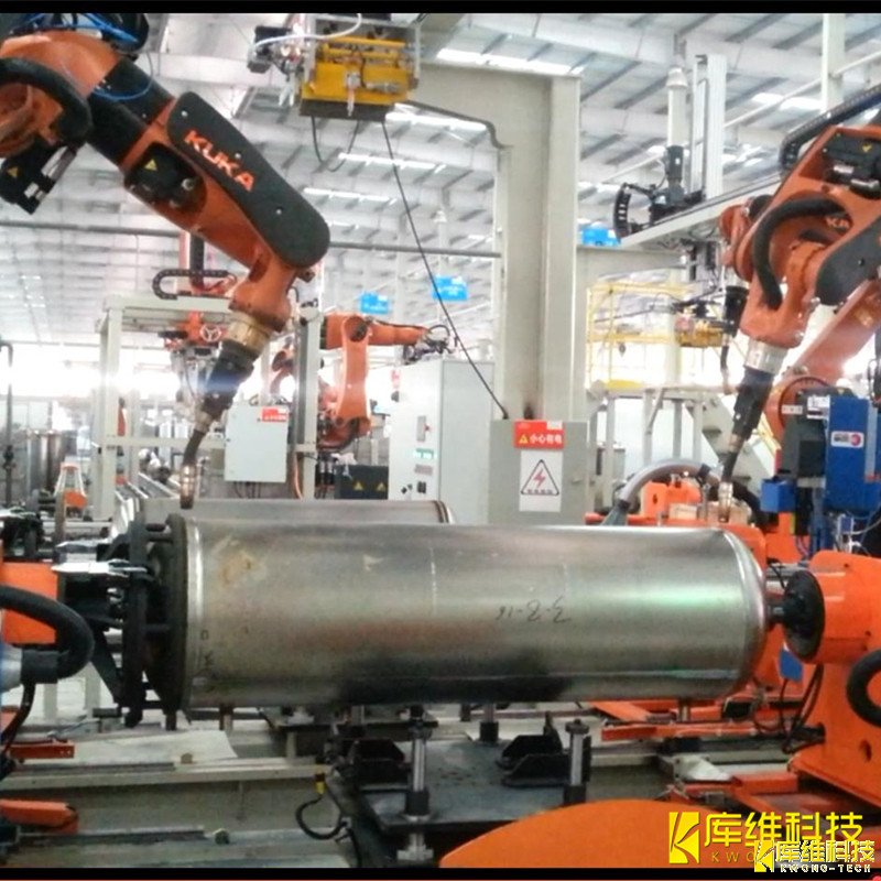 庫維科技于2015年與某企業合作建設智能壓力容器(熱水器內膽)自動化焊接生產線項目,成功實現經濟效益和產能效益雙提升。壓力容器智能機器人柔性自動化生產線是由柔性機器人工作站及輸送線體組成的一站式柔性自動化生產線。生產線通過集成視覺檢測及對位、自動焊接、自動搬運及其它各種輔材等功能來實現壓力容器的自動生產。